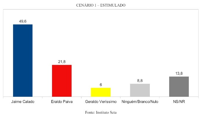 No cenário 1, Jaime Calado teria 49,6 % dos votos, contra 21,8% de Eraldo Paiva. Geraldo Veríssimo aparece com 6% dos votos. Branco/nulo são 8,8%.